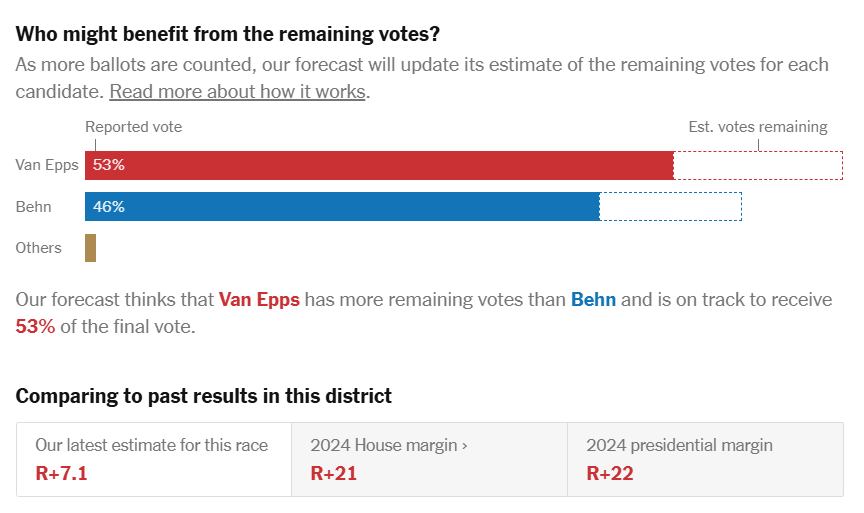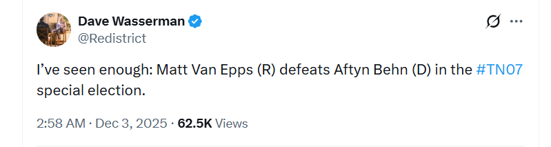 Related: Editorials & Other Articles, Issue Forums, Alliance Forums, Region ForumsDave Wasserman: I've seen enough: Matt Van Epps (R) defeats Aftyn Behn (D) in the #TN07 special election.