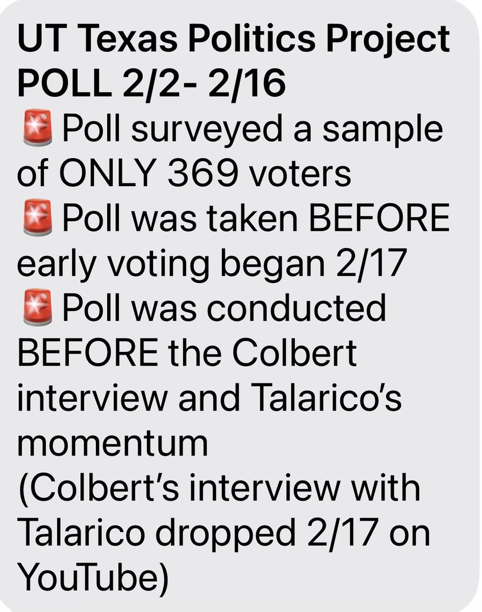 (1,860 posts)Cobert aired his interview with Talarico on Feb.16. This poll was taken from Feb 2-16.