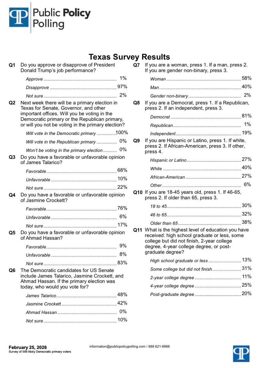 Link to poll: https://static1.squarespace.com/static/68a237ed87f54c4157d6fcae/t/699fc465ccebdf5f9f4c89e3/1772078181510/TexasDemocraticResults+2.25.pdf