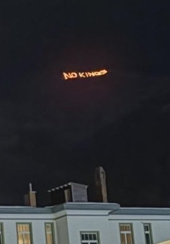 As President Trump began his news conference stateside in Davos, we spotted the words NO KINGS - in all caps - glowing on the mountainside overlooking the World Economic Forum site where Trump speaks tomorrow.