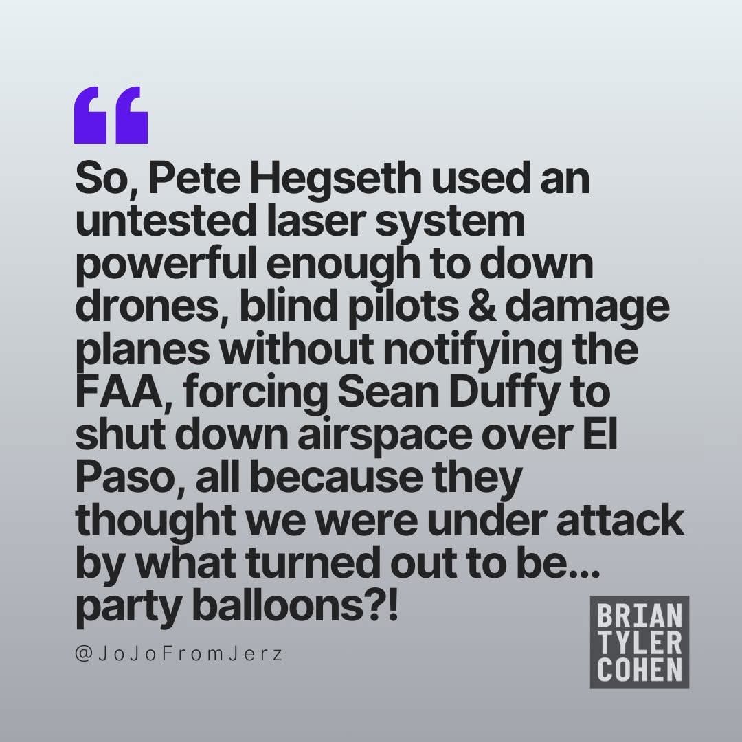 (12,865 posts)I can just see the scene. Mylar heart balloon appears in the distance. CBP idiot one yells "cartel drones!! CBP idiot two is thrilled to fire the laser weapon. DOD personnel hides faces in hands as planned "test" goes off the rails. White House hears about the incident. How do you know it wasn't cartel drones? Must have been. That's the story and we're sticking to it!! El Paso planes report interference. Panic ensues. Airspace ten-day shutdown announced. Chaos ensues. White House tells Duffy to order the F.A.A. to reopen the f-ing airspace.