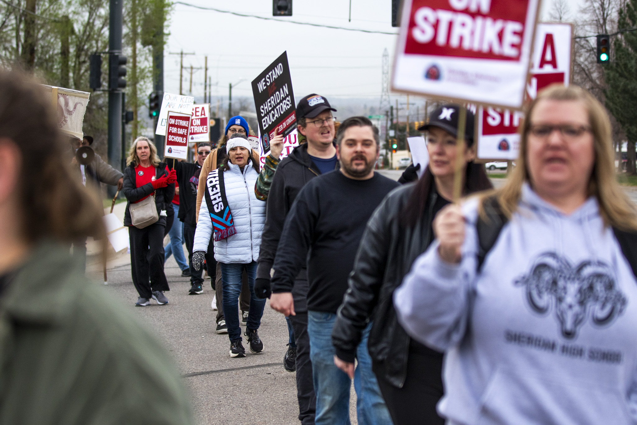 Members of the Sheridan Educators Association picket outside of Sheridan High School on the first day of a strike. April 1, 2026.