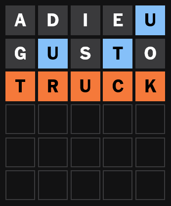 NY Times average 3.5 and Wordlebot in 3. My strategic guess chosen to eliminate 'truce' or 'trunk' worked! Love it when that happens!